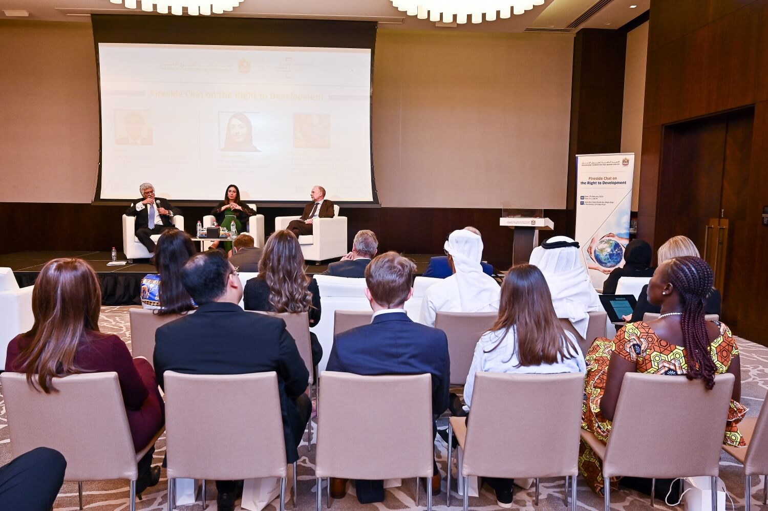 وضمت الجلسة عدداً من السفراء والدبلوماسيين والطلاب، وتناولت نشأة إعلان الحق في التنمية ومفهومه ومحتواه ومبادئه الأساسية ذات الصلة بحقوق الإنسان وأهداف الأمم المتحدة للتنمية المستدامة.