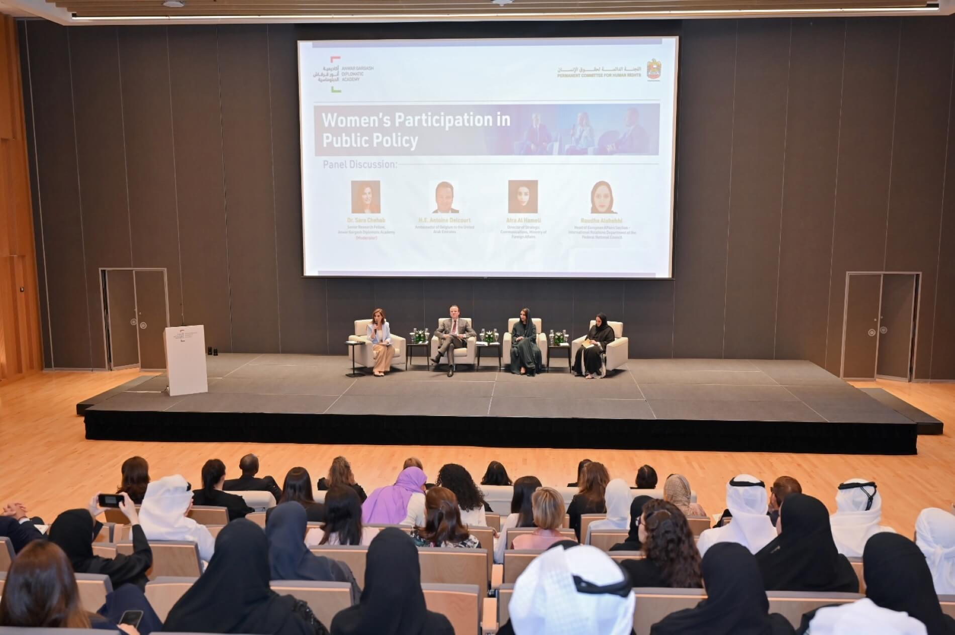 وأُقيمت الفعالية أمس بمناسبة اليوم العالمي للمرأة في الدبلوماسية، وشهدت حضور عدد من الدبلوماسيين والمسؤولين الحكوميين من دولة الإمارات وأوروبا، بهدف استكشاف آليات تطوير السياسات التي تعزز المساواة بين الجنسين، وتدعم وصول المرأة إلى الأدوار القيادية. وتسهم المشاركة المتكافئة للمرأة في الحياة العامة في تحسين الأطر المعيارية والتشريعية في مجالي حقوق الإنسان والتنمية المستدامة على حد سواء. وناقش المتحدثون ضرورة تمكين المرأة لتولي المناصب القيادية، وأهمية ذلك في إرساء سياسات شاملة في مختلف المجالات.